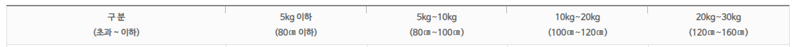 개선 중에 가장 고민스러웠던 것은 맨 마지막 행에 있는 권장 사이즈였다. 표는 기본적으로 머리 행과 열을 통해 정보를 전달하는데, 권장 사이즈는 따로 행을 내어서 표기하기엔 머리 행(S,M,L,XL)와 중복되는 느낌이었다. 이를 해결하는 데에 좋은 아이디어가 되었던 곳이 우체국 요금 안내표였다. 좋은 데이터 테이블의 예시로 우체국 사이트의 요금 안내표가 있었는데 필요한 정보들을 정갈하게 전달하는 느낌이었다. 주목해서 본 점은 하나의 행에 두 가지 정보가 함께 있는 행이 번잡하지 않았다는 점인데 여기서 아이디어를 얻어 옷 사이즈 테이블에 적용했다.