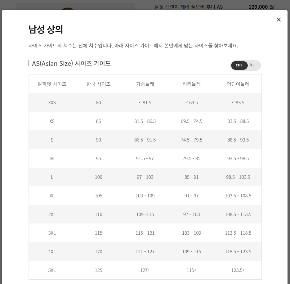 우선 나이키의 옷 사이즈 표는 짝수 열에 배경색을 다른 색으로 두어 행 구분을 쉽게 할 수 있었다. 또한 이전 예와는 다르게 한국사이즈라는 정보를 따로 표기해 명확하게 정보를 전달하고 있다. 추가로 단위를cm와 inch로 바꿀 수 있게 버튼을 따로 만들어 편의를 제공하고 있다. 한 가지 아쉬운 점은 사이즈 표가 커서 그런지 버튼 클릭을 통해 표가 나오도록 만들었는데, 접근하는 버튼이 작고 흐릿한데다가 버튼처럼 보이지 않아 접근성이 떨어졌다.