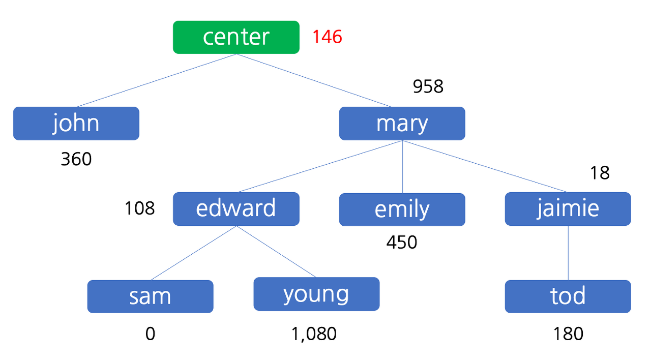 민호는 다단계 조직을 이용하여 칫솔을 판매하고 있습니다. 판매원이 칫솔을 판매하면 그 이익이 피라미드 조직을 타고 조금씩 분배되는 형태의 판매망입니다. 어느정도 판매가 이루어진 후, 조직을 운영하던 민호는 조직 내 누가 얼마만큼의 이득을 가져갔는지가 궁금해졌습니다. 예를 들어, 민호가 운영하고 있는 다단계 칫솔 판매 조직이 아래 그림과 같다고 합시다.
