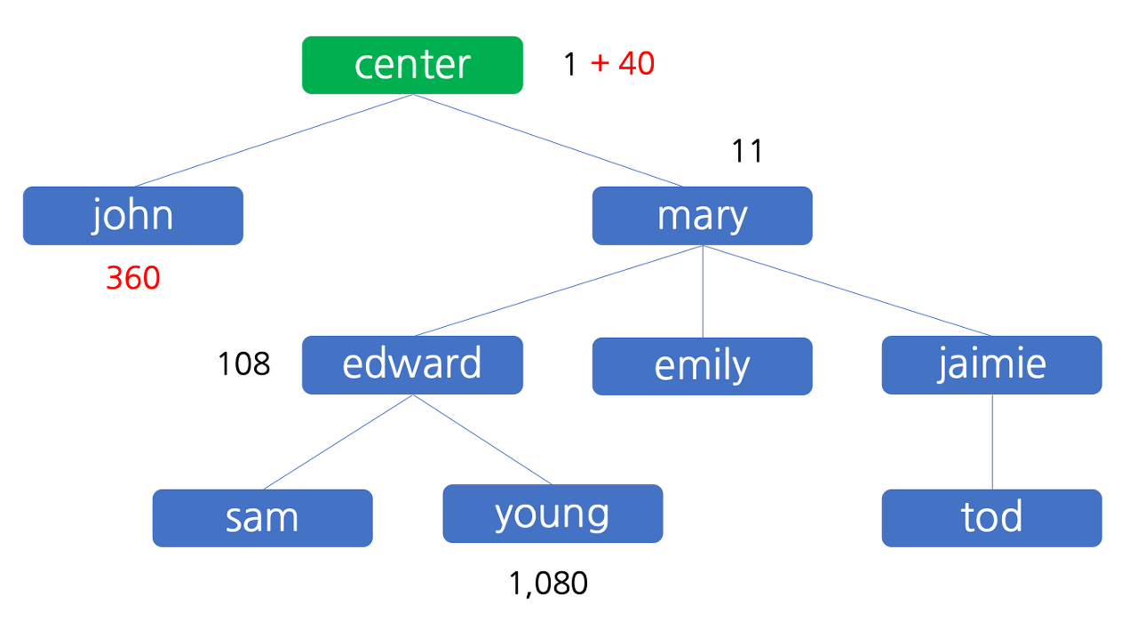 판매원 young 에 의하여 1,200 원의 이익이 발생했습니다. young 은 이 중 10% 에 해당하는 120 원을, 자신을 조직에 참여시킨 추천인인 edward 에게 배분하고 자신은 나머지인 1,080 원을 가집니다. edward 는 young 에게서 받은 120 원 중 10% 인 12 원을 mary 에게 배분하고 자신은 나머지인 108 원을 가집니다. 12 원을 edward 로부터 받은 mary 는 10% 인 1 원을 센터에 (즉, 민호에게) 배분하고 자신은 나머지인 11 원을 가집니다. 이 상태를 그림으로 나타내면 아래와 같습니다.