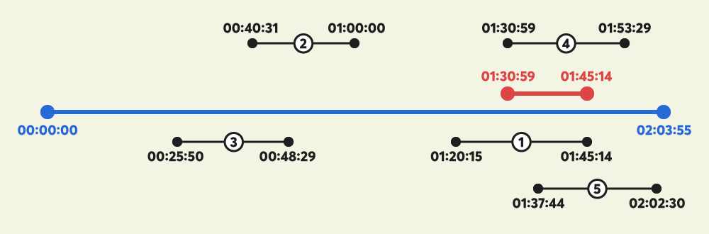 | "02:03:55" | "00:14:15" | ["01:20:15-01:45:14", "00:40:31-01:00:00", "00:25:50-00:48:29", "01:30:59-01:53:29", "01:37:44-02:02:30"] | "01:30:59" |
