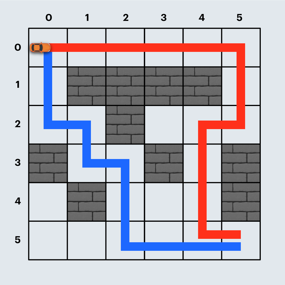 - board는 항상 출발점에서 도착점까지 경주로를 건설할 수 있는 형태로 주어집니다.