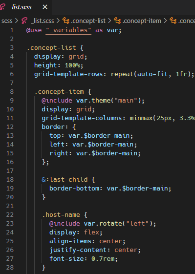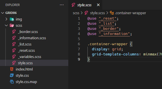 - scss파일 이름의 맨 앞에 underscore(_)를 주면 css로 컴파일하지 않겠다는 의미(모듈로만 사용)
